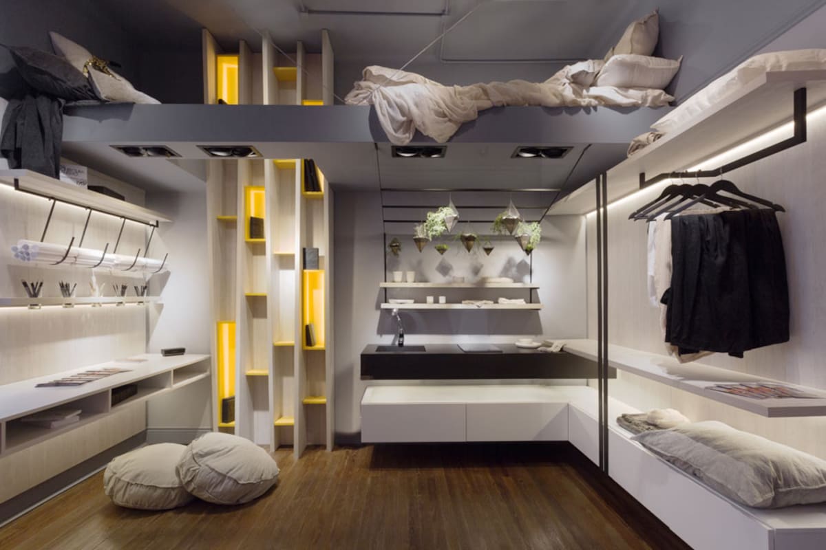 Espacio 9 - Monoambiente de un estudiante, de María Zuker, María Belén Bickham y Horacio Zuker. Proponen una vivienda desarrollada en 14m2, donde aprovechan la altura del espacio. El descanso se desarrolla en el eje vertical, mientras que las actividades diarias se desenvuelven en el plano horizontal. La forma de conectar las áreas es a través de una biblioteca que funciona, al mismo tiempo, como escalera.