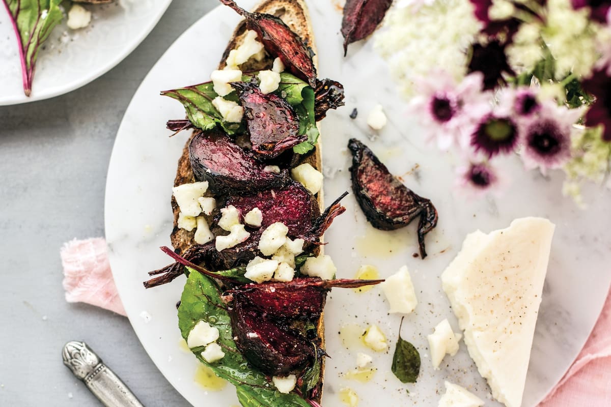 Armar la bruschetta dorando el pan en un grill y luego frotando un diente de ajo. Agregar las hojas de remolacha, las remolachas y el queso de cabra desgranado y terminar con aceite de oliva, sal y pimienta.