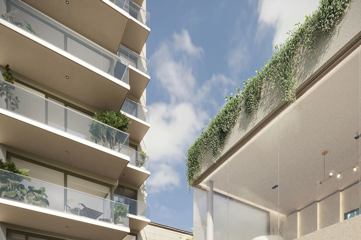 El proyecto incorpora además una serie de amenities orientados a la vida urbana contemporánea, como piscina con solarium, SUM en dos niveles con playroom, gimnasio funcional, laundry, bicicletero y un hall de entrada de diseño contemporáneo. La propuesta se completa con un local comercial en planta baja y subsuelo, una oficina en el primer piso y una terraza accesible.
